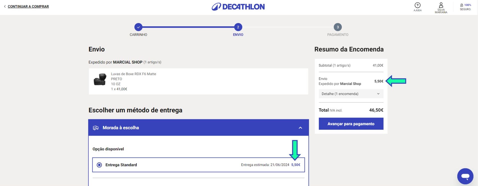 Os custos de envio de produtos Marketplace são visíveis ao selecionar o método de envio que pretende no carrinho de pagamento.