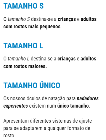 Os nossos óculos de natação para principiantes e para intermédios estão disponíveis em 2 tamanhos: o tamanho S e L.