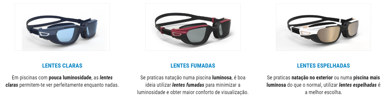 Alguns dos nossos óculos de natação têm cores de lentes diferentes na lente, para que se possam adaptar a diferentes tipos de luminosidades nas piscinas.