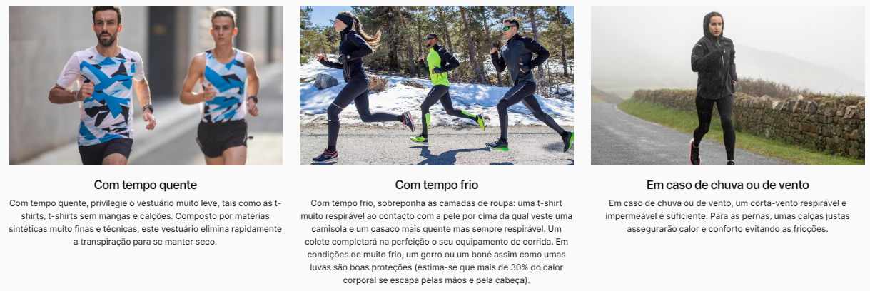 A escolha do seu vestuário de corrida deve ter em conta, principalmente, as condições meteorológicas mas também a intensidade do esforço.