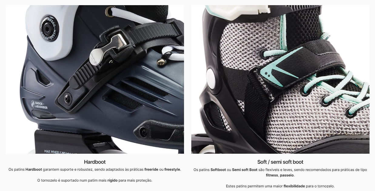O botim interior é um elemento muito importante dos teus patins. Em função da tua prática, deves escolher um botim interior mais ou menos rígido, que permite mais fluidez ou mais suporte.